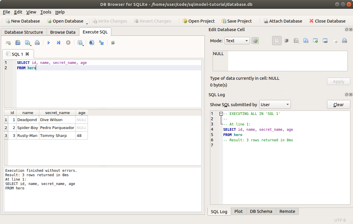 SELECT hero.id, hero.name, hero.secret_name, hero.age